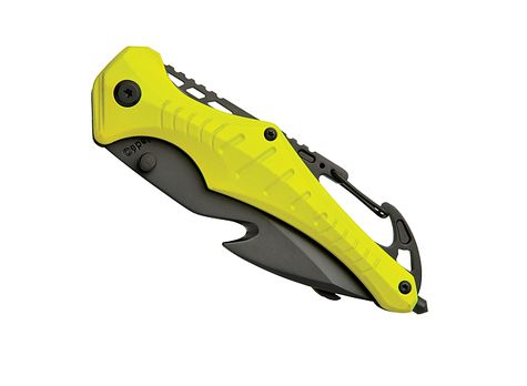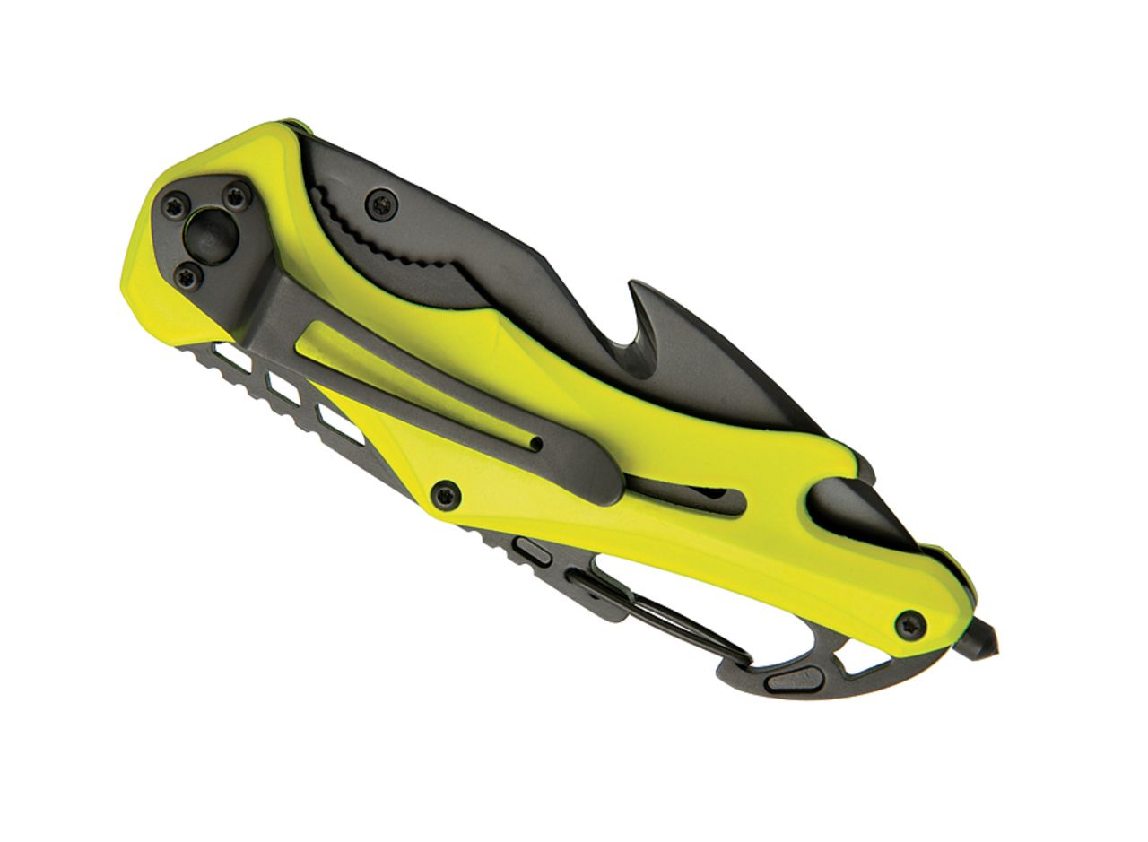 - Seat belt cutter with razor sharpening and window breaker in tugnsten carbide on this rescue knife for emergency situations.