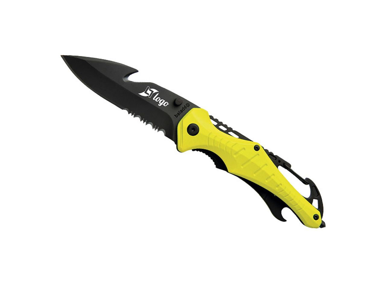 Folding pocket knife with a 420 stainless steel blade with titanium coating. Blade with a fine part (for precision cutting) and a micro-serrated part (for heavy duty task). Fluorescent yellow anodized aluminium handle. One-handed opening/closing with a Liner lock safety system. Torx screw assembly. Seat belt cutter on the blade and window breaker hammer functions in tungsten carbide at the back of the handle. Bottle opener, carabiner and belt clip. Heather grey RPET pouch included.