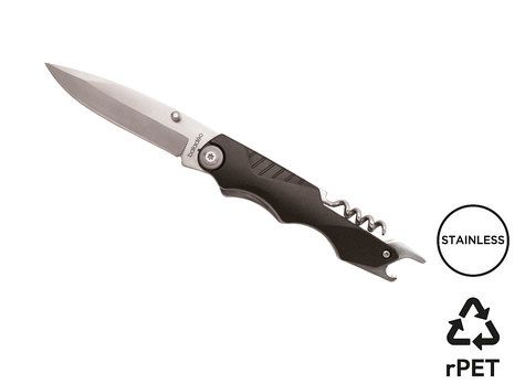 Folding knife with a 420 stainless steel blade. Aluminium and stainless steel handle. Bottle opener and corkscrew with 4 stainless steel spirals. One-handed opening/closing with a Liner lock safety system. Torx screw assembly. Heather grey RPET pouch included.