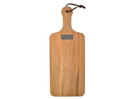 Solid acacia wood. Metal plate with titanium coating. PU leather strap. Can also be used as a serving board.