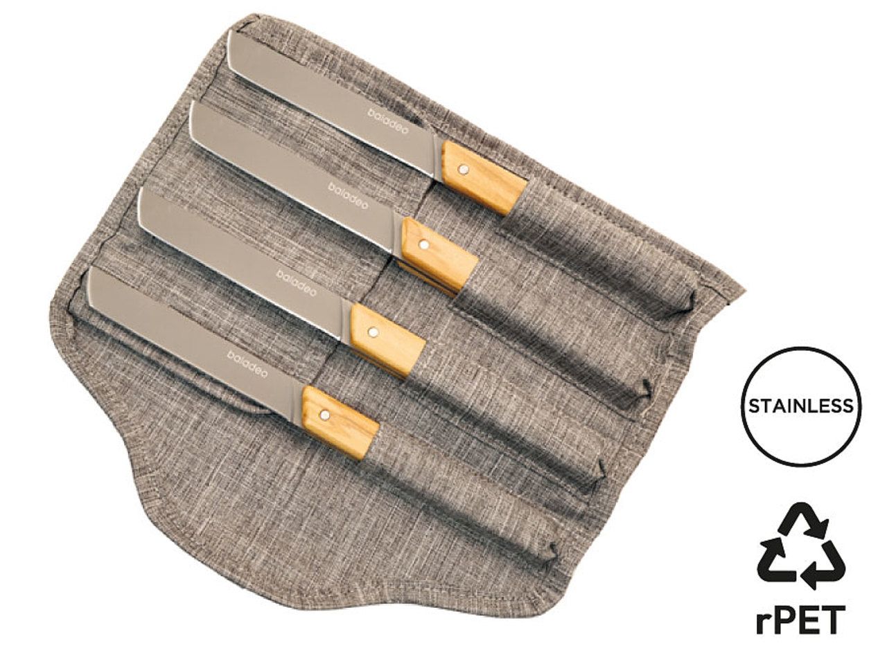 10cm food-grade 420 stainless steel blades (martensitic steel compliant with EN10088-2 2005 standard) with titanium coating. Ribbed olive wood handles. Heather grey RPET roll-up storage included.