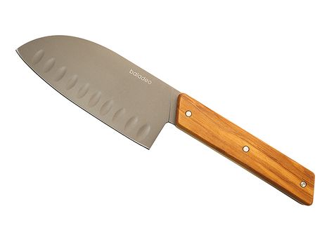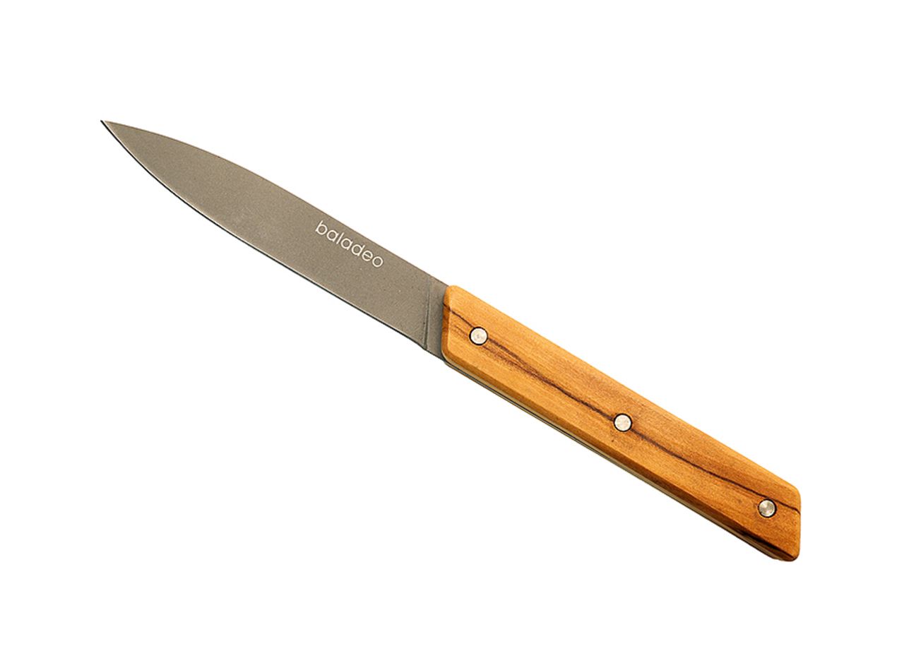 Food-grade 420 stainless steel blades (martensitic steel compliant with EN10088-2 2005 standard) with titanium coating. A Santoku knife (11cm blade), a utility knife (10cm blade), and a serrated tomato knife (10cm blade). Ribbed olive wood handles. Heather grey RPET roll-up storage included.