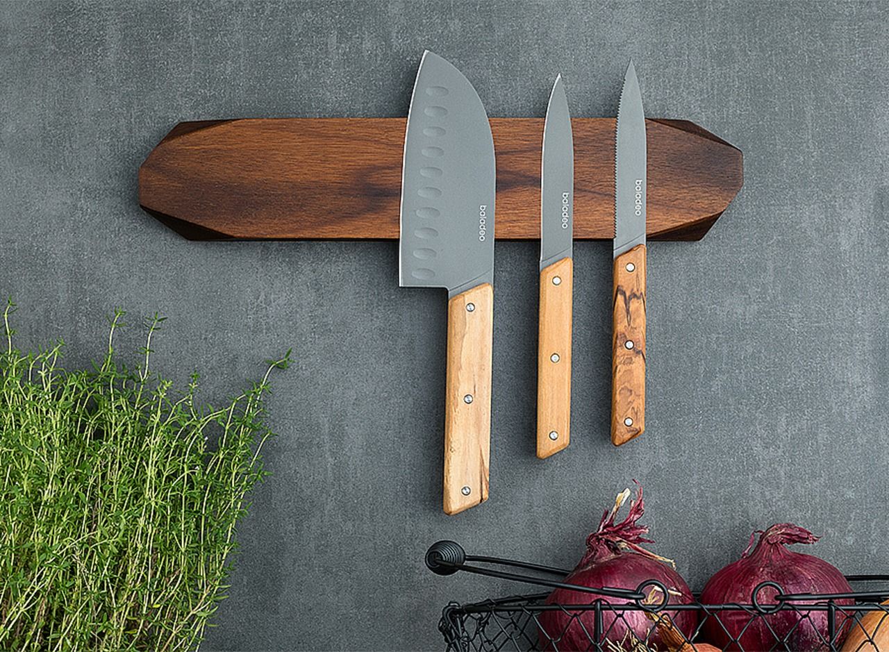Acacia wood and Ferrite magnets. To hang on the wall for knives and other metallic items. 30cm long.